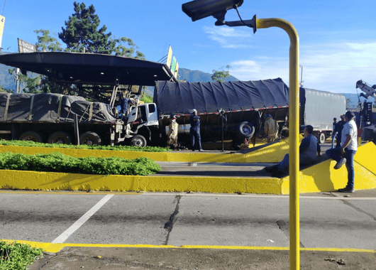 El hecho ocurrió hacia las 6:50 a.m., cuando un tractocamión Kenworth color morado colisionó con un camión Foton blanco.