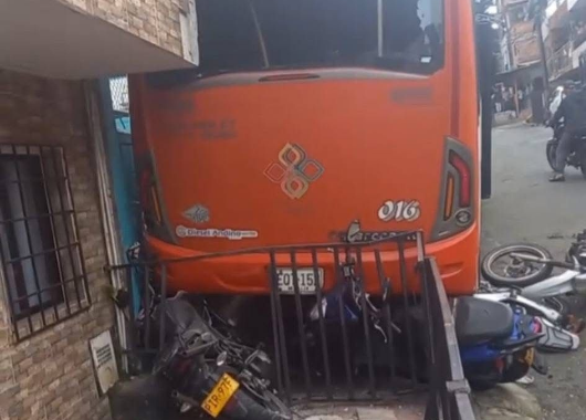 Un bus de servicio público que cubría la ruta de Santa Cruz, en la comuna 4-Aranjuez de Medellín, perdió el control tras presentar fallas en los frenos. El vehículo impactó varias motocicletas y causó daños materiales en una vivienda del sector.