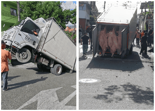 Un camión que transportaba cerdos quedó varado este miércoles en la calle 99 del barrio Castilla, en el noroccidente de Medellín.