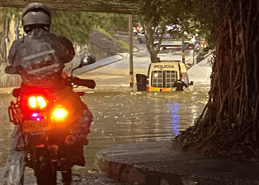 Durante la emergencia, un vehículo de la Policía quedó atrapado en medio de la inundación, lo que obligó a los uniformados a solicitar apoyo para poder retirarlo del lugar.