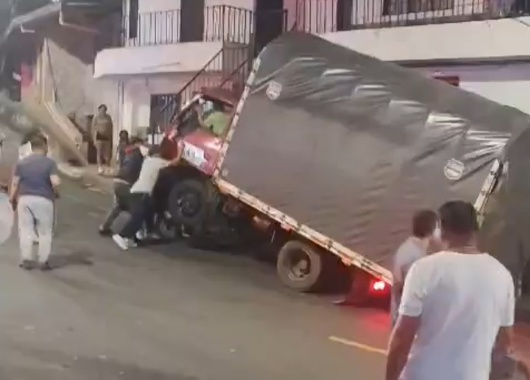 Al parecer, el vehículo transportaba más carga de la permitida, lo que habría provocado que la cabina se levantara parcialmente del pavimento, generando alarma entre los vecinos. Por fortuna, el incidente no dejó personas heridas ni daños mayores.