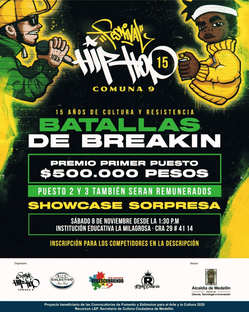 La apertura será el sábado 8 de noviembre en la Institución Educativa La Milagrosa (Cra. 29 #41–14), con un conversatorio, showcases, cyphers y la esperada batalla de Breaking y DJ “Conexión Real: Almas Gemelas del Hip Hop”, que exaltará la conexión entre el movimiento y el vinilo, con la participación de reconocidos B-Boys, B-Girls y DJ’s locales.