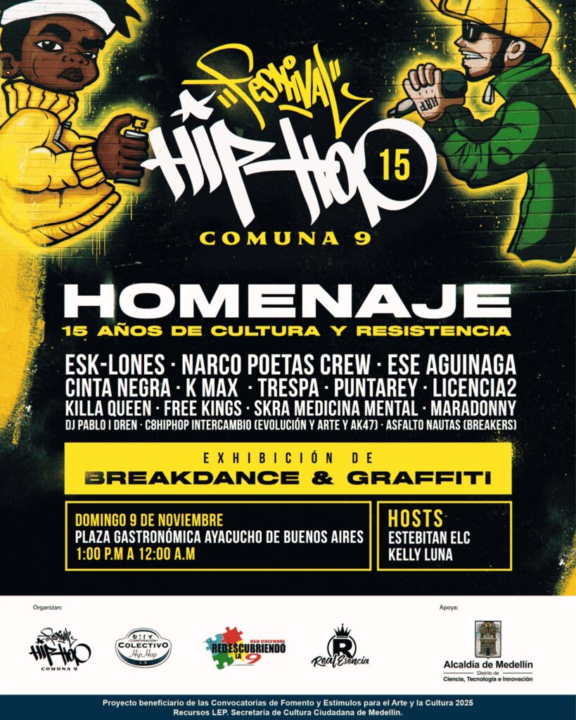 El Festival de Hip Hop de la Comuna 9 celebra este fin de semana sus 15 años de historia, consolidándose como uno de los encuentros culturales más representativos de Medellín. Esta edición especial rendirá homenaje a la cultura, la memoria y la unión de los cuatro elementos del Hip Hop: DJ, Rap, Breaking y Graffiti.