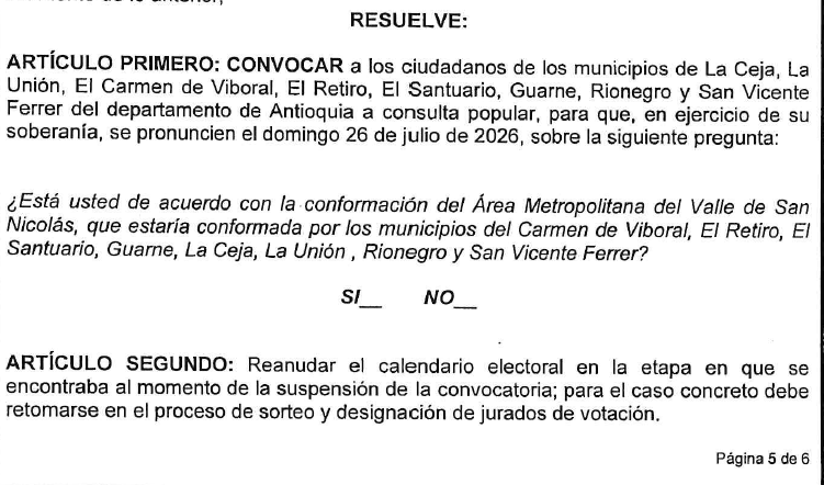 La Registraduría Nacional dio vía libre a la consulta popular que definirá si se crea o no el Área Metropolitana de Oriente antioqueño. La jornada de votación deberá realizarse el domingo 26 de julio de 2026, de acuerdo con la convocatoria oficial.