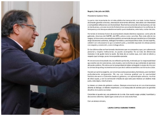 A través de una carta abierta publicada en sus redes sociales, Laura Camila Sarabia anunció este jueves 3 de julio su renuncia al cargo de canciller de Colombia, decisión que fue comunicada formalmente al presidente Gustavo Petro.