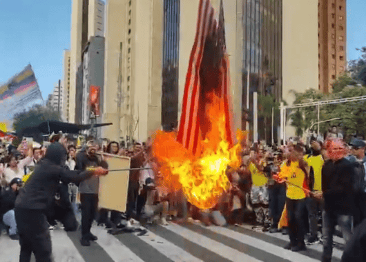 En medio de una protesta este miércoles en el centro de Medellín, un grupo de manifestantes incendió una bandera de Estados Unidos y un retrato del presidente Donald Trump sobre la Av. Oriental, a la altura del sector conocido como La Oriental.
