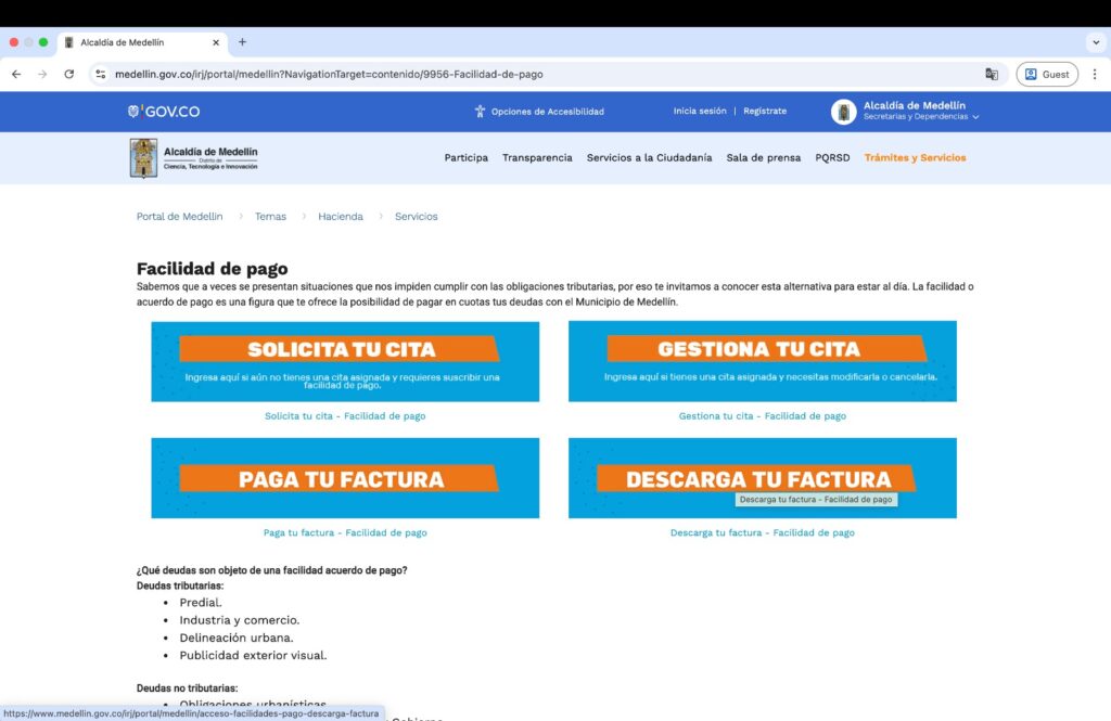📌 Si deseas acceder a estas facilidades de pago, entra a www.medellin.gov.co, busca el bloque Contenidos Destacados, haz clic en Facilidades de pago y luego en Agenda y gestiona tu cita.