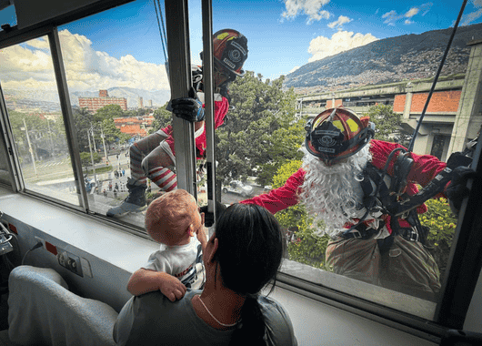 La sorpresa fue total cuando, desde sus habitaciones, vieron aparecer a Papá Noel descendiendo por las fachadas del hospital. La visita hizo parte de una jornada liderada por Bomberos de Medellín y la Alcaldía, quienes se tomaron las instalaciones para regalar sonrisas, música y momentos de alegría.