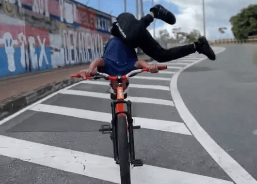 En redes sociales se viraliza un video que muestra a un joven realizando una arriesgada acrobacia en plena vía: conduce una bicicleta con la cabeza apoyada en el sillín y el cuerpo completamente vertical hacia arriba, mientras avanza sobre el puente de la Madre Laura.