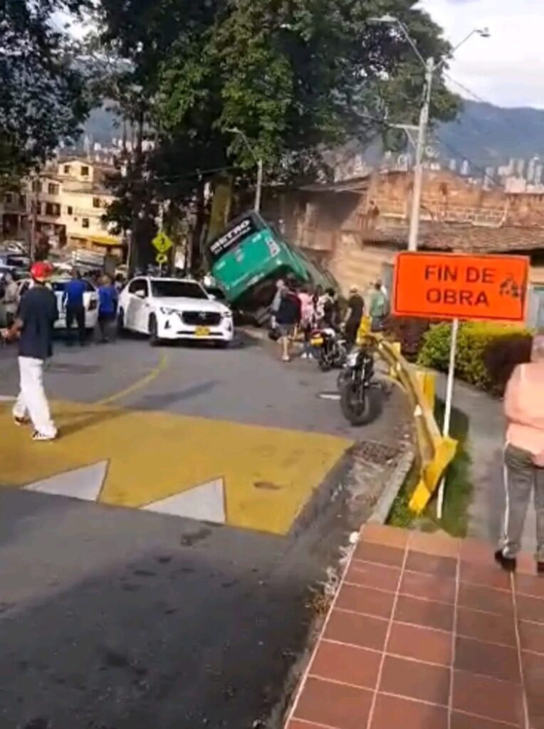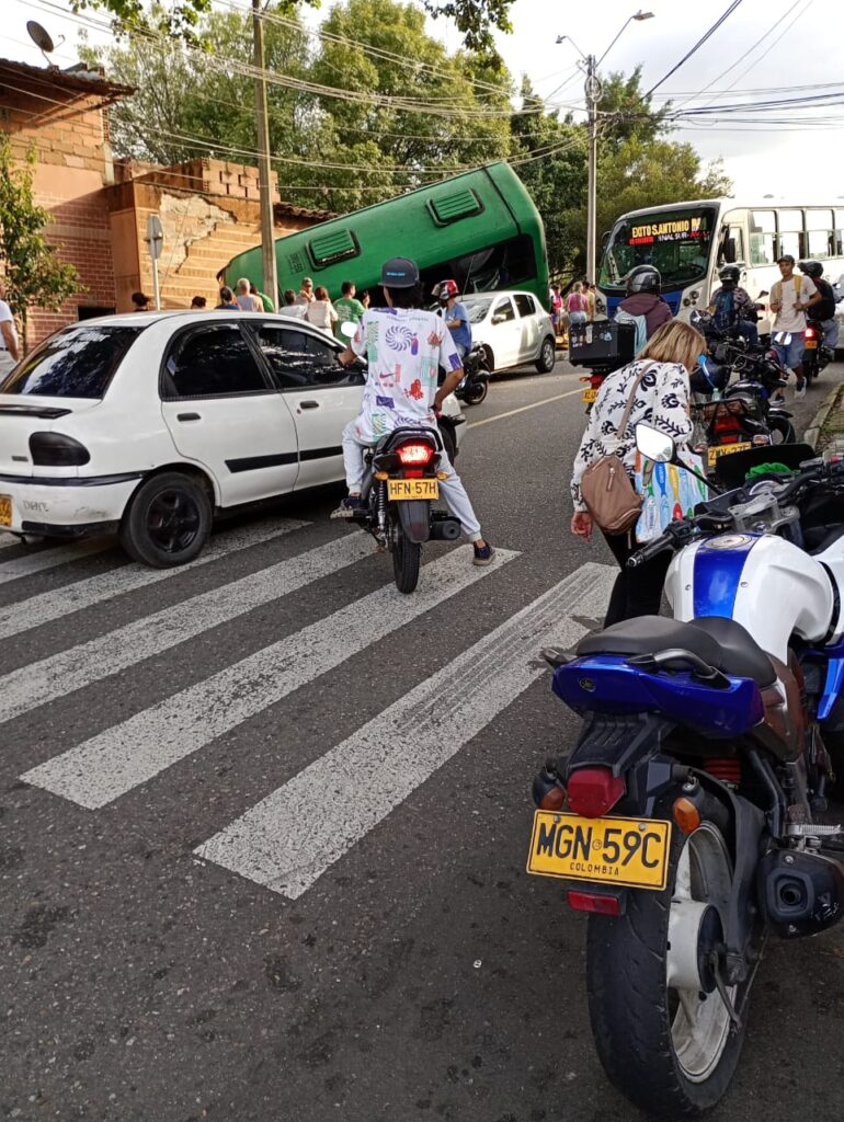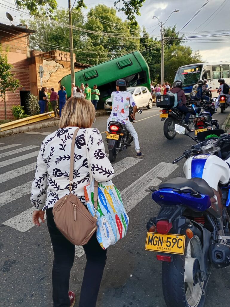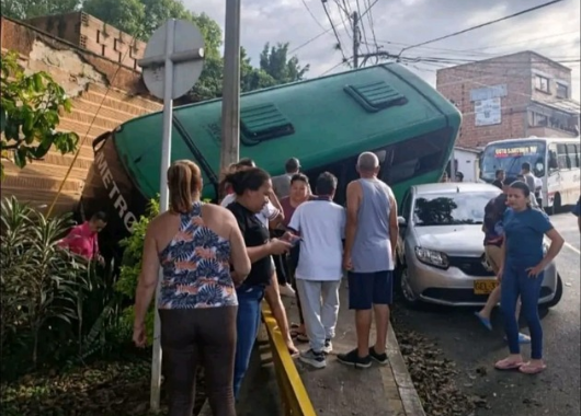 Un aparatoso accidente de tránsito se registró en el sector de Guayabal, en la zona conocida como La Colinita, cuando un bus perdió el control y terminó volcado, impactando contra el muro de una vivienda.